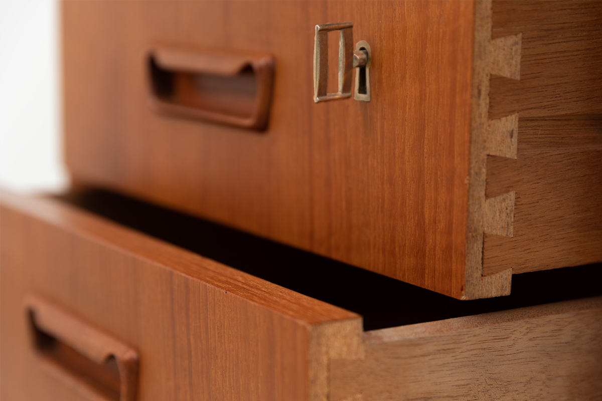 Der Tisch ist bei Bedarf erweiterbar durch seitlich verschiebbare Tischplatten. Der doppelte Schubladencontainer ist mit zwei Messing-Zugankern fixiert. Die Schubladen sind mit hochwertiger Schwalbenschwanz-Zinkung gefertigt und mit integrierten massiven Griffmulden ausgestattet. Der Schlüssel von der verschließbaren Schublade ist vorhanden.