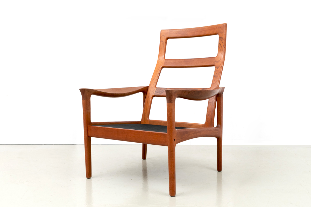 Ein Sessel mit hoher Lehne und sphärisch ausgearbeitete Armlehnen aus massiven Teakholz. Die geschwungenen Lehnen haben eine tolle Maserung und sind aus einem Holzstück gefertigt. Die Quertraversen mit Seitenelementen wurden gedübelt und geschraubt, der eingepasste Sitzrahmen wurde mit neuen Polstergurten und neuem bezugschützendem Spannstoff versehen. Verwendung von hochwertigen Polsterstoff, abziehbar durch Reißverschlüsse in den Kissen.