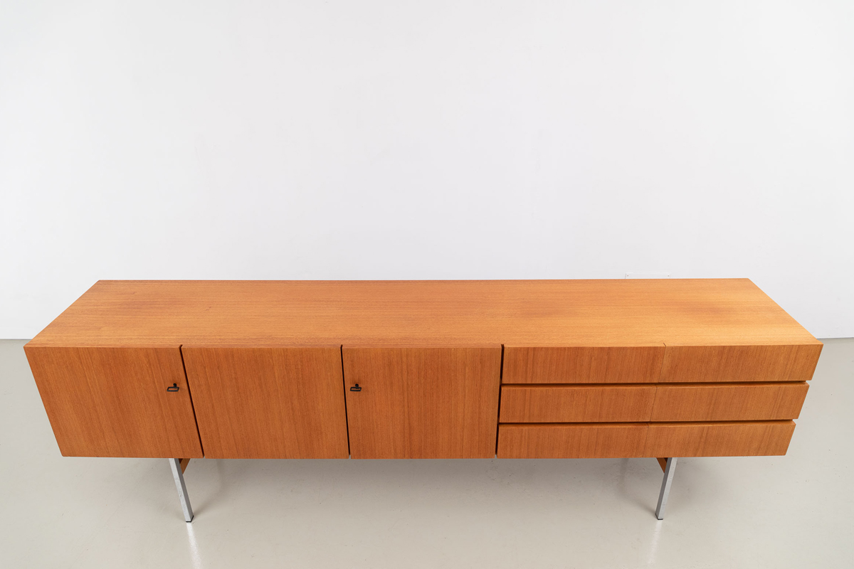 Musterring hat die deutsche Wohnkultur entscheidend mitgestaltet. Seine Produktionen repräsentieren Reduktion und Funktionalität. Der selten gewordene Designklassiker mit großzügigen Ablageflächen bietet dazu viel Stauraum. Sechs große Schubladen fügen sich dezent zurückhaltend in das rechteckig, minimalistische Design ein. Für die drei Schrankelemente sind beide Schlüssel vorhanden.