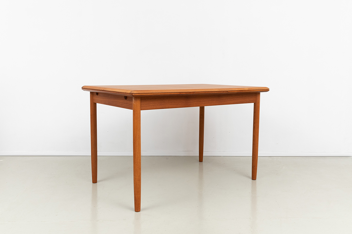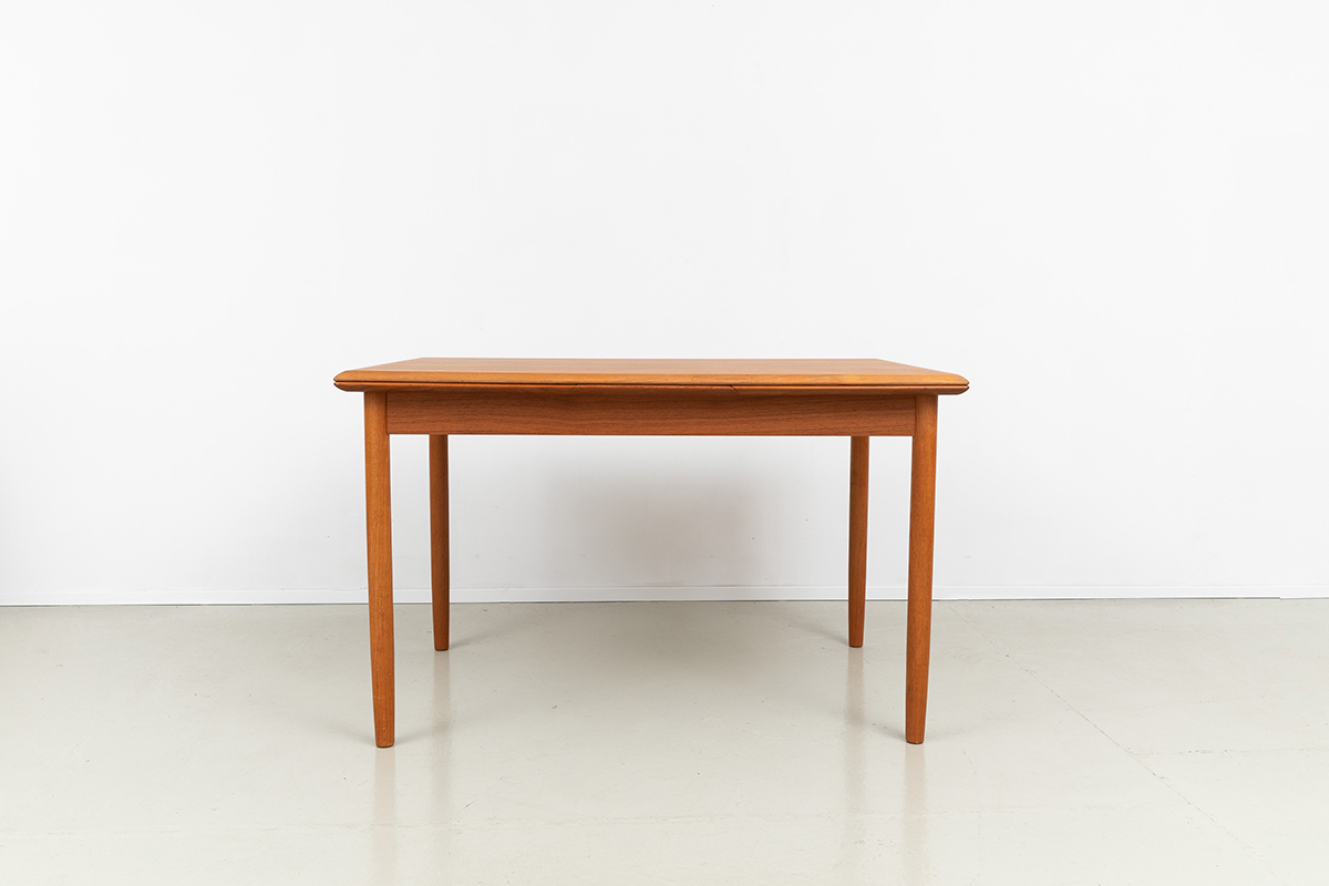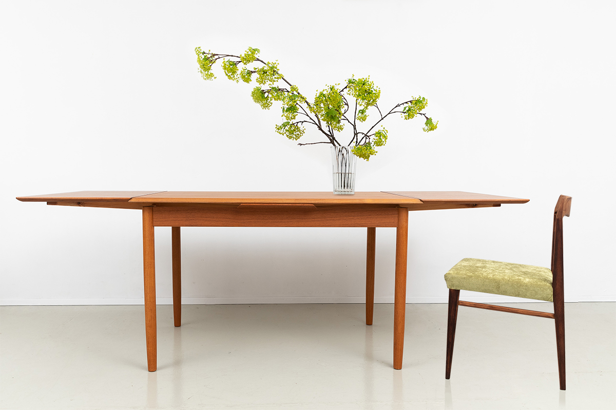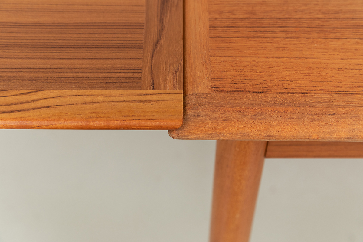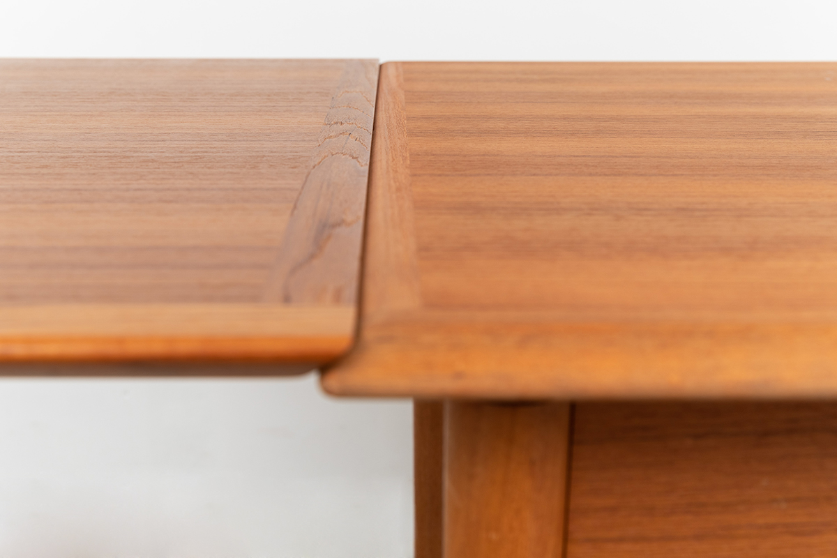 Dieser Esstisch aus Teak mit schöner Holzmaserung kann beidseitig ausgezogen werden. Der Tisch ist eine schöne Ergänzung zu einem Esszimmer oder Büroflächen.